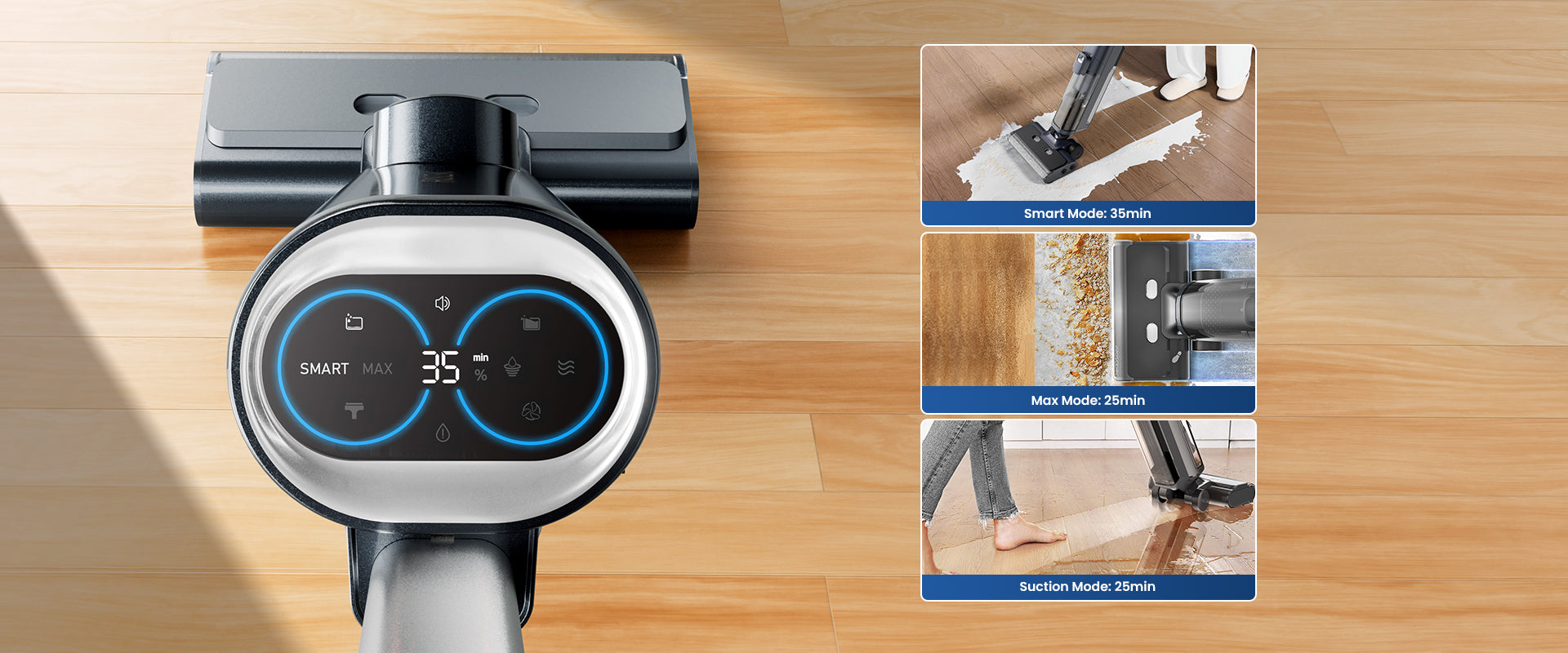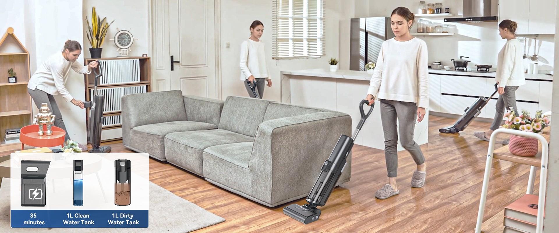 La batteria rimovibile da 6×2.500 mAh garantisce fino a 35 minuti di utilizzo con una sola carica. I serbatoi separati da 1 L per acqua pulita e sporca permettono di pulire fino a 120 ㎡ senza interruzioni. (*Batterie aggiuntive acquistabili separatamente per prolungare l’autonomia.)