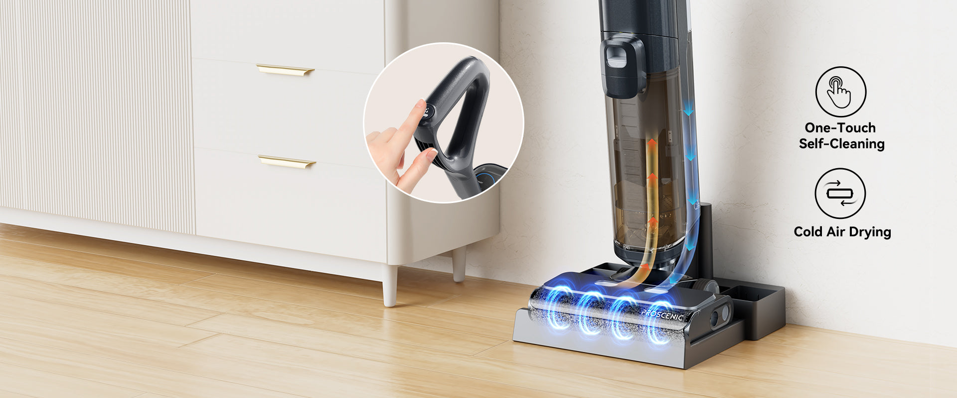 Premendo un solo pulsante, il rullo e il tubo interno vengono lavati a fondo. Al termine, l’asciugatura centrifuga elimina l’umidità dal rullo, mantenendolo igienico, fresco e senza cattivi odori.