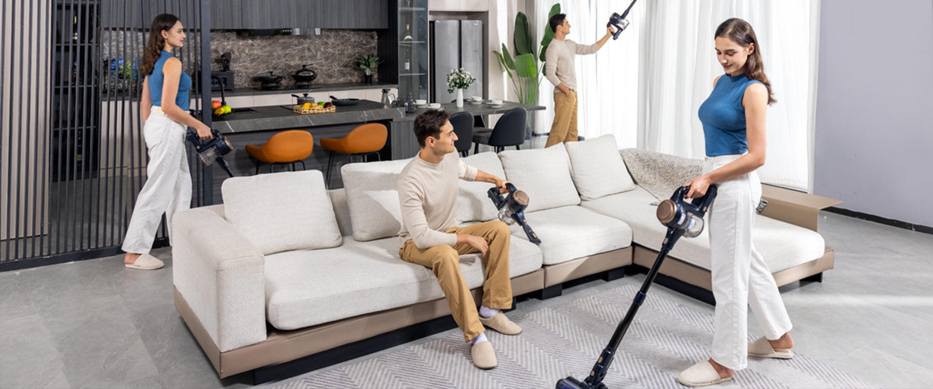 Dotato di sei batterie rimovibili da 2.200 mAh, offre oltre 50 minuti di pulizia continua. Scegli tra due modalità di potenza per bilanciare aspirazione e durata della batteria.