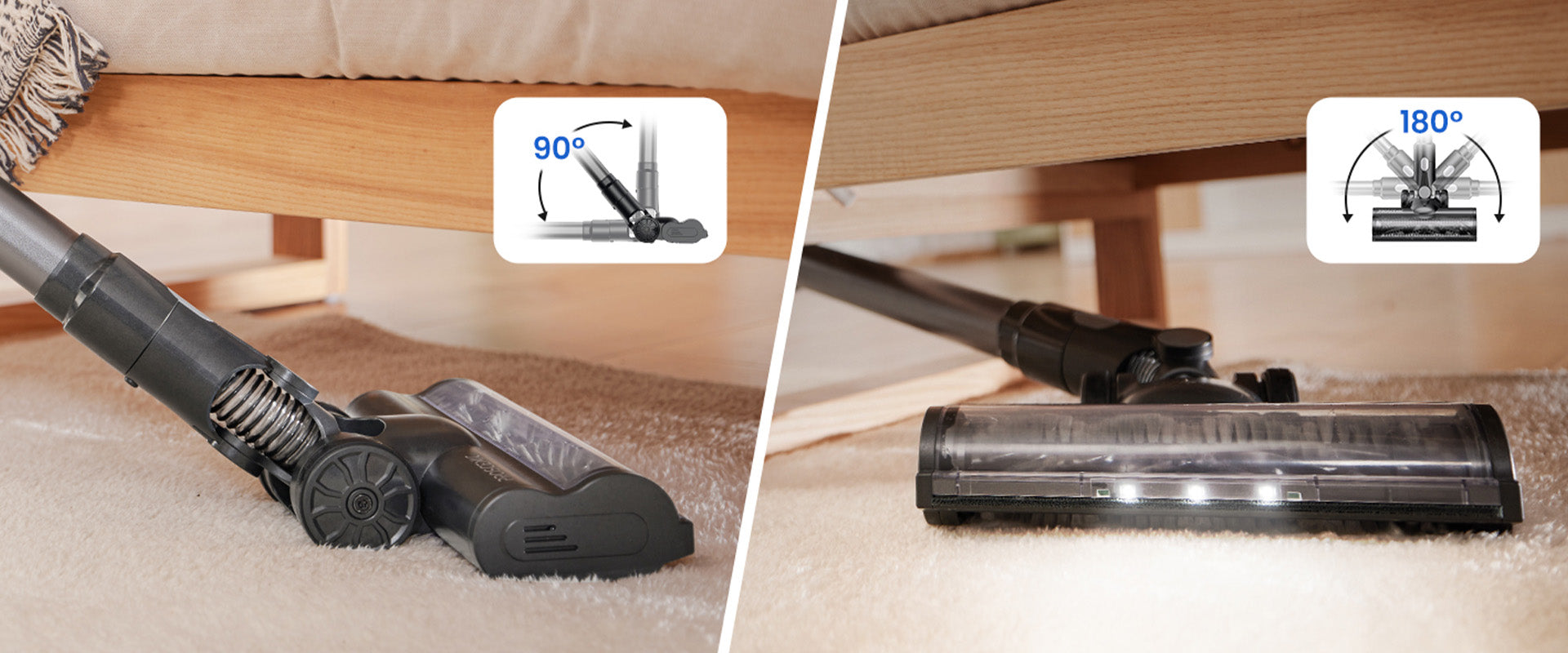 Si abbassa completamente e ruota a 180°, permettendo di arrivare sotto letti, divani e spazi stretti—per una pulizia completa.