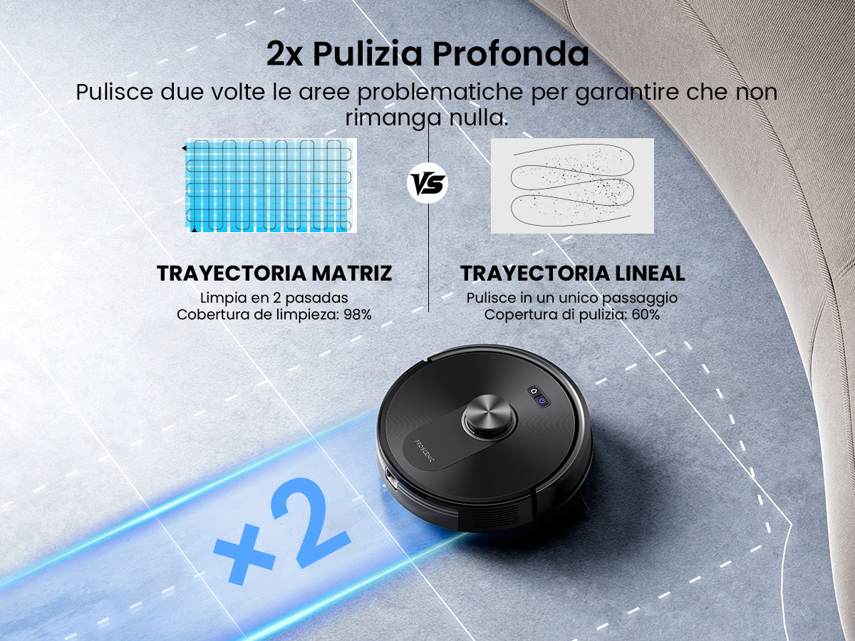 Aggiornato da 6000 Pa, il Proscenic Q10 offre una pulizia più profonda su tappeti e pavimenti duri, catturando sporco e peli di animali in meno passaggi.