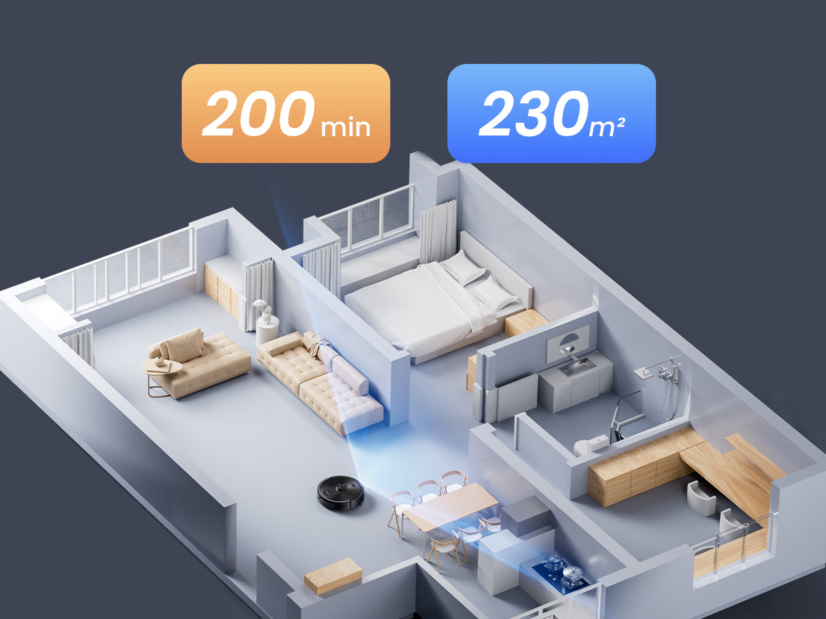 Pulisce case grandi in un’unica sessione, riducendo le interruzioni e la necessità di ricariche manuali.