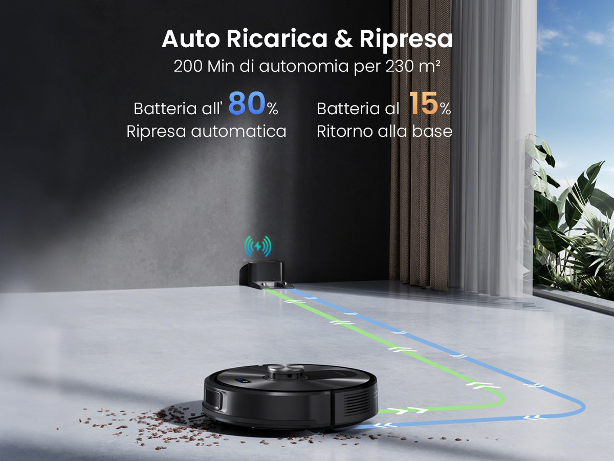 Si ricarica automaticamente al 15% e riprende la pulizia all’80%, completando il ciclo senza bisogno di supervisione.