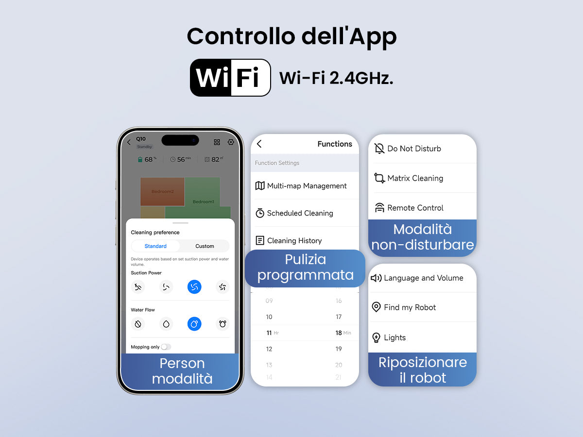 Memorizza fino a 5 mappe per diverse piante della casa, permettendoti di spostare facilmente il robot tra i piani. Il Q10 riconosce l’ambiente e inizia subito la pulizia.