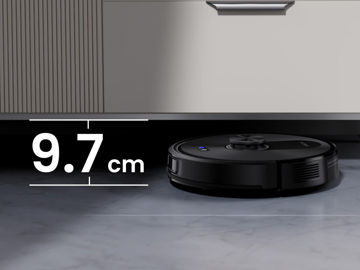 Il design sottile da 9,7 cm del Proscenic Q10 gli permette di passare sotto divani, letti e mobili bassi, rimuovendo facilmente polvere e peli nascosti.